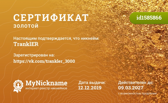 Certificate for nickname TranklER is registered to: https://vk.com/trankler_3000