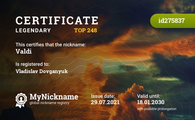Nickname Valdi is registered to Vladislav Dovganyuk. Issued certificate ID275837. Issue date 29.07.2021.