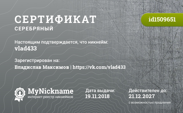 certificate for nickname: vlad433 (id1509651)