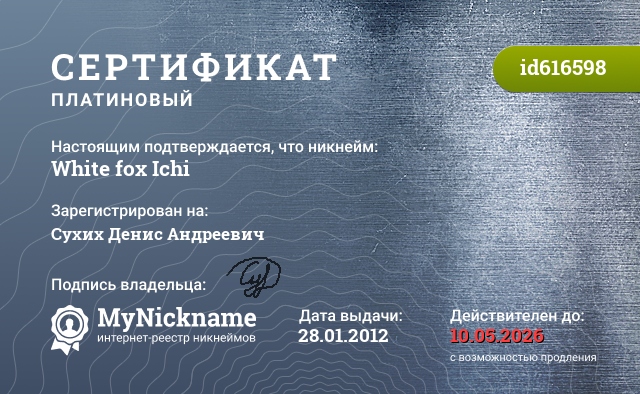 сертификат на никнейм White fox Ichi (id616598)
