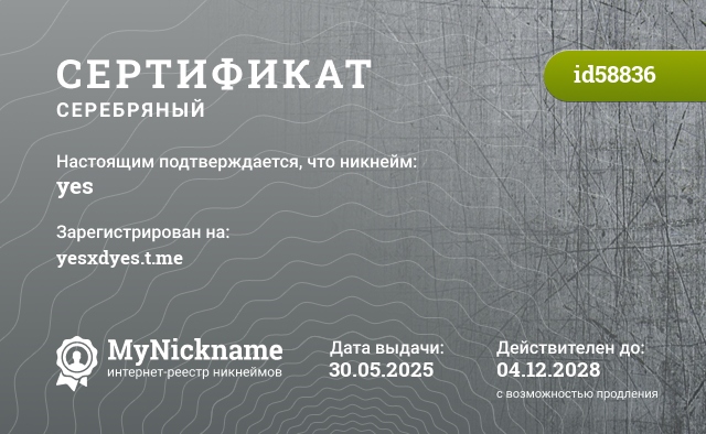 Никнейм yes зарегистрирован на yesxdyes.t.me. Выдан сертификат id58836. Дата выдачи 30.05.2025.
