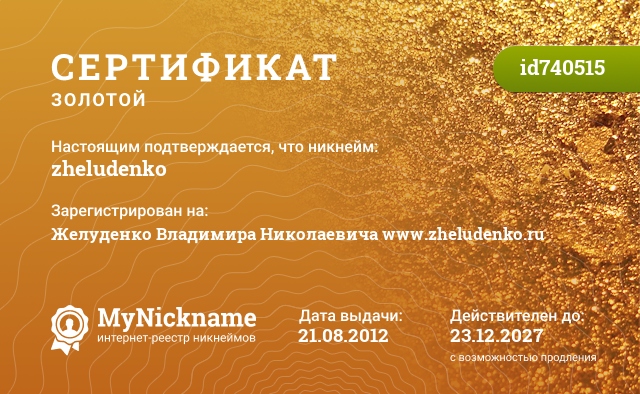 Сертификат на никнейм zheludenko, зарегистрирован на Желуденко Владимира Николаевича www.zheludenko.ru